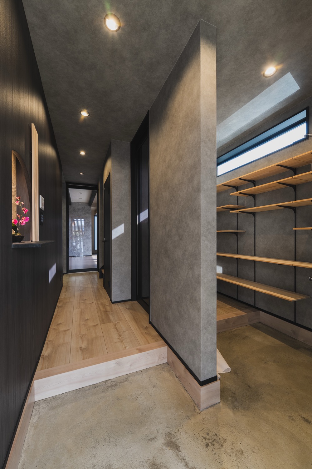土間玄関は、右手に家族用の大容量シューズクロークをつけました。