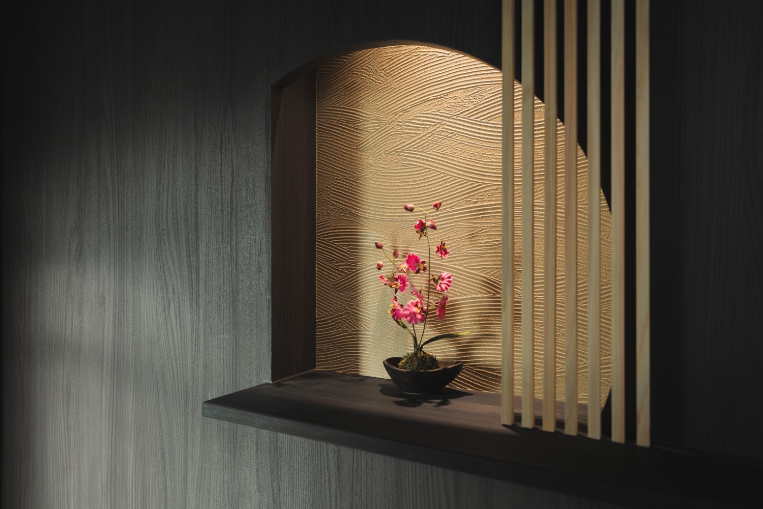 職人による美しい波が描かれたニッチでは、季節のお花や雑貨を飾っていただいています。