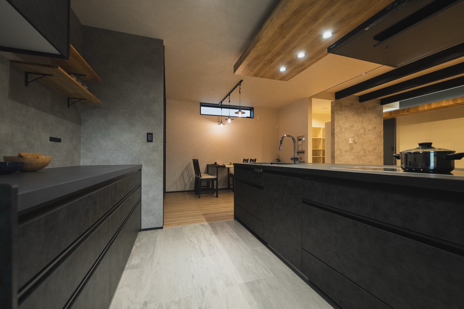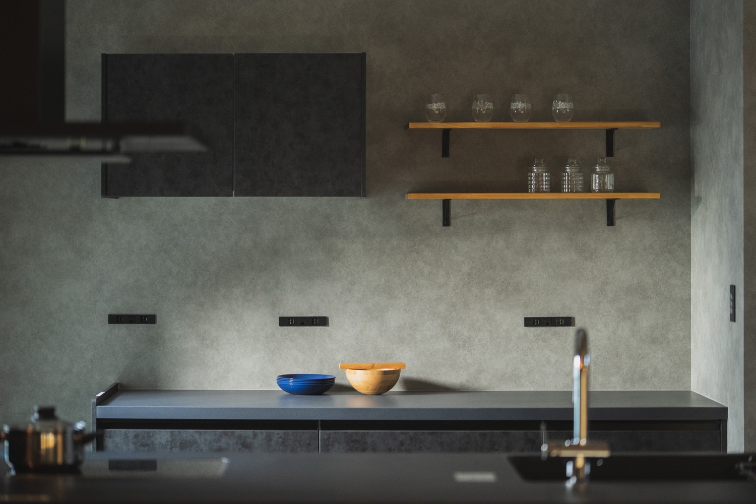 背面側にもたっぷりの収納を設けて、生活感が出にくいおしゃれなキッチンになりました。